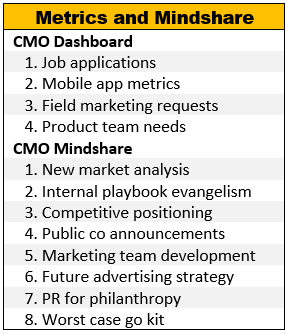 After these daily production driven things, I would guess CMO attention is divided between: 1) Analyzing and prioritizing potential new markets, 2) Internal evangelism of the brand playbook, 3) Competitive positioning and pricing, 4) Public co stuff like announcements and disclosures or material items, and 5) Marketing team development, and 6) Future advertising strategy, and 7) A PR plan for the philanthropy stuff, and 8) some kind of a disaster preparedness program to be ready for the negative stuff. It is an exhausting list!