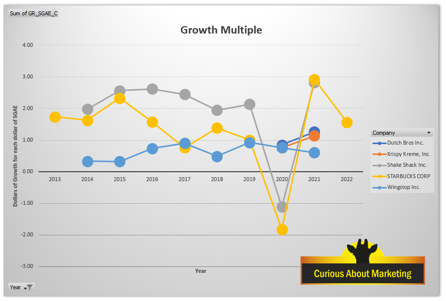 Again the pandemic warps Starbucks and Shake Shack’s numbers, and makes the chart a bit hard to read. Dutch Brothers performs slightly better than Krispy Kreme, and both are getting more than a dollar of growth back for every dollar spent. Note: I have removed non-cash executive compensation from the SGA expense numbers for all companies – which had the biggest effect on Dutch Brothers.